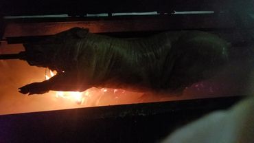 Our smokers Roasters are custom made and large enough to accommodate a whole hog up to 80 lbs. In the event that your pig is over 80lbs we require you to use our Heavy Duty Motor at an additional cost of $50. Unique features are slide out charcoal drawers for easy stoking of the heat and smoke, two grills within that are ideal and convenient for cooking corn, built in thermometer, automatic spit and roatiserie control, and easy open lid. Morning to Morning